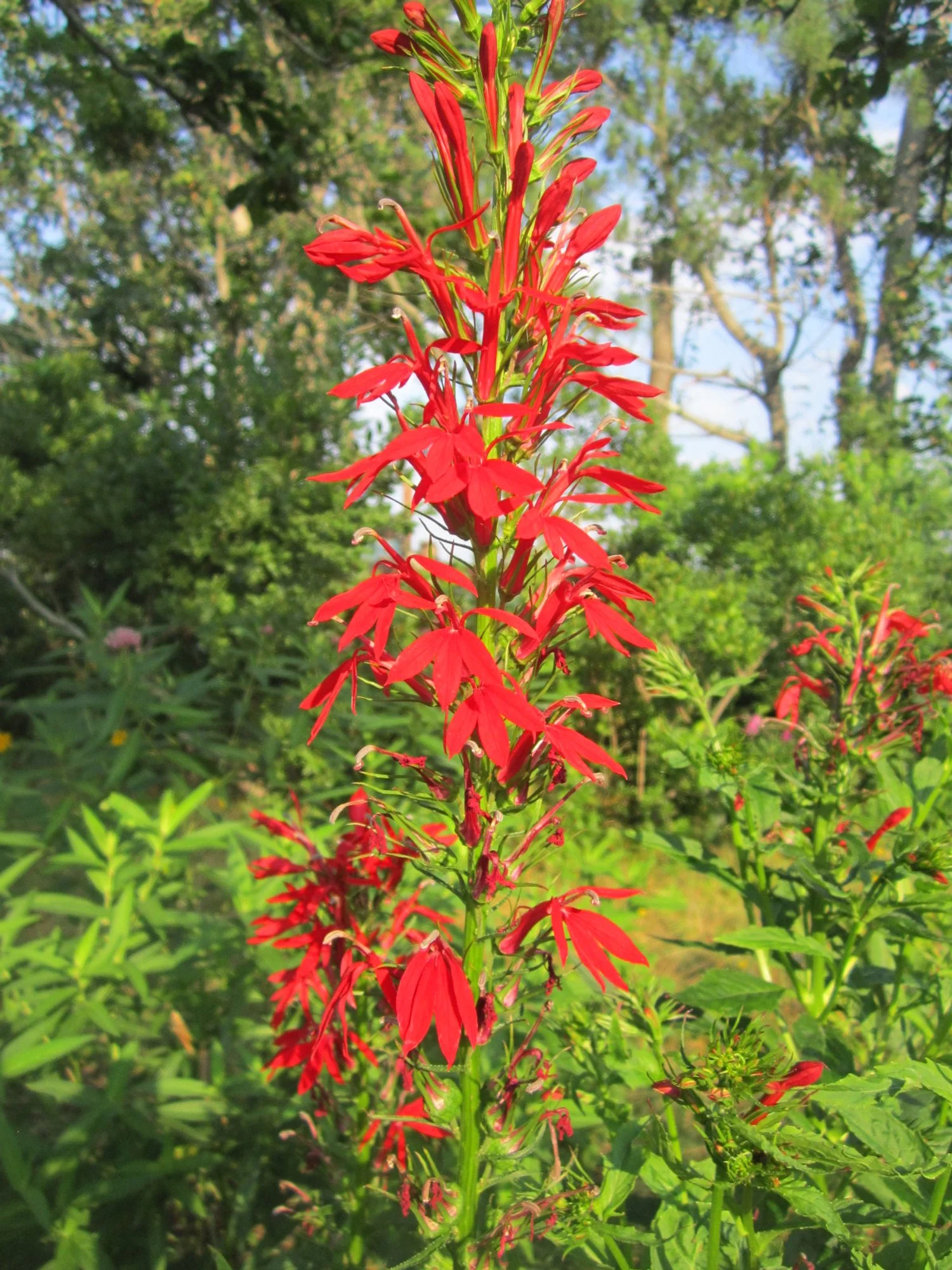 The cardinal flower has a tubular structure with the nectar at the bottom of the tube. Only humming birds with their long beaks or butterflies with long tongues can reach this nectar. Although it likes moist areas, it seems to be surviving in our meadow.
