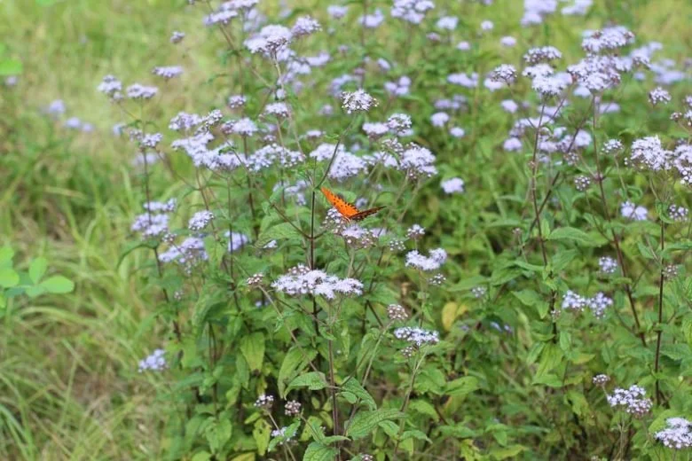 Blue Mist Flower is colorful part of fall blooms when blues and yellows are the dominant colors. It is a power player in attracting bees and butterflies. If you are lucky, you might see a Monarch Butterfly enjoying its nectar. Blue Mist Flower can be found across diverse environments because it loves all kinds of soil. As a matter of fact, it spreads so aggressively through its roots and seeds that it is often considered a nuisance – certainly the case in our meadow.